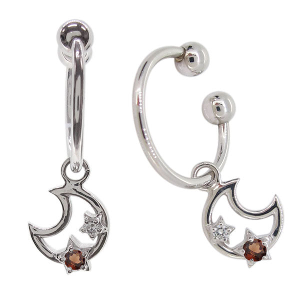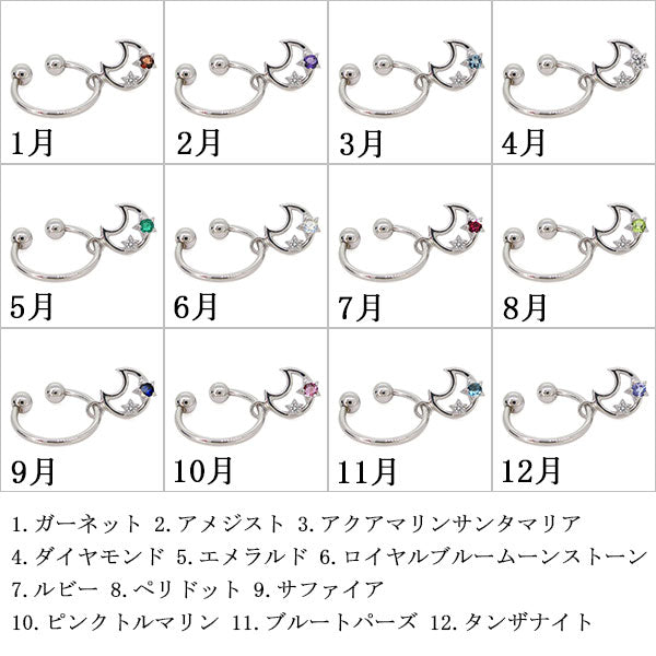 誕生石12石を使用した、三日月(ムーン)と星(スター)をモチーフにしたフープイヤリングです。煌めく天然石の星が、艶やかに光る月に寄り添った可愛らしいイヤリングです。耳にはめ込むタイプなので、ピアスホールがあいていない方もお楽しみいただけます。