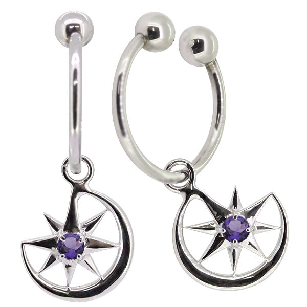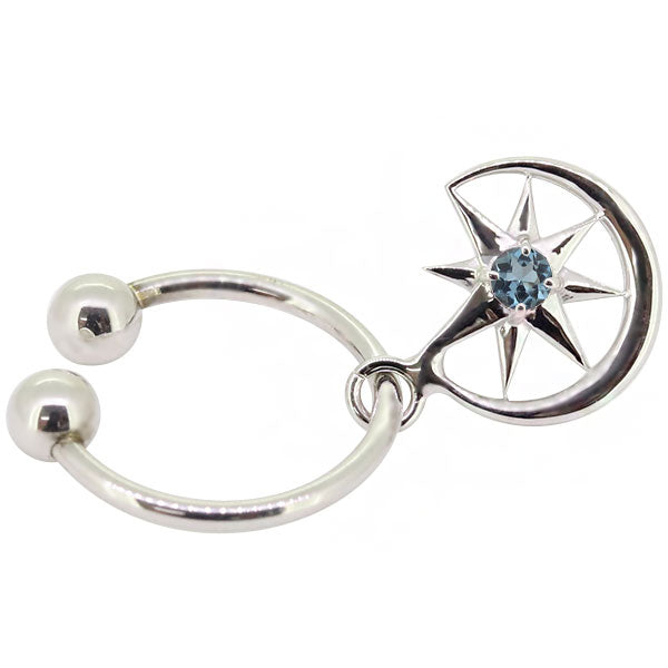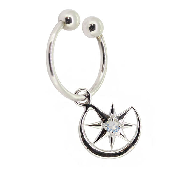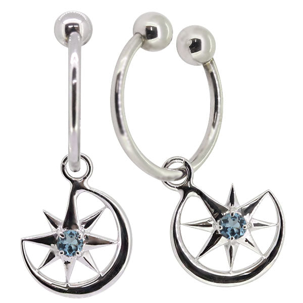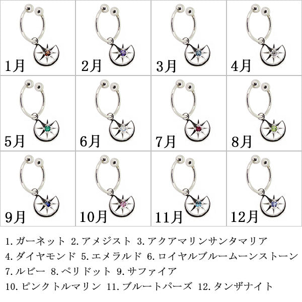誕生石12石を使用した、三日月(ムーン)星(スター)モチーフのフープイヤリングです。耳に挟むタイプですので、ピアスホールがあいていない方もお楽しみいただけます。煌めく天然石の星が三日月に寄り添った可愛らしいデザイン。プレゼントなどにもおすすめです。