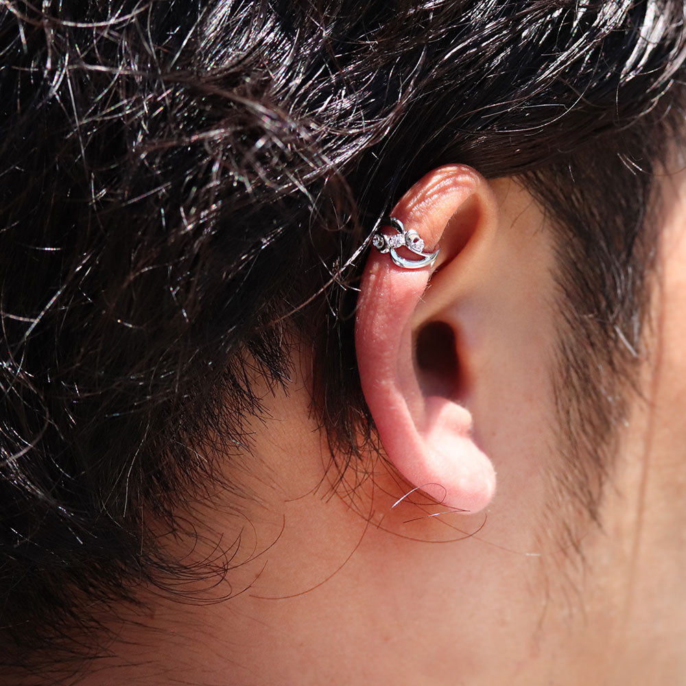 誕生石12石を使用した、メンズイヤーカフです。透かし模様のおしゃれなデザインが、大人の男性の魅力を引き出してくれます。耳にはめ込むタイプなので、ピアスホールがない方も簡単に装着することができます。重ね付けをしたりお好きな位置につけてお楽しみください。ユニセックスデザインですのでレディースにもオススメですし、お揃いにしてもおしゃれな商品です。