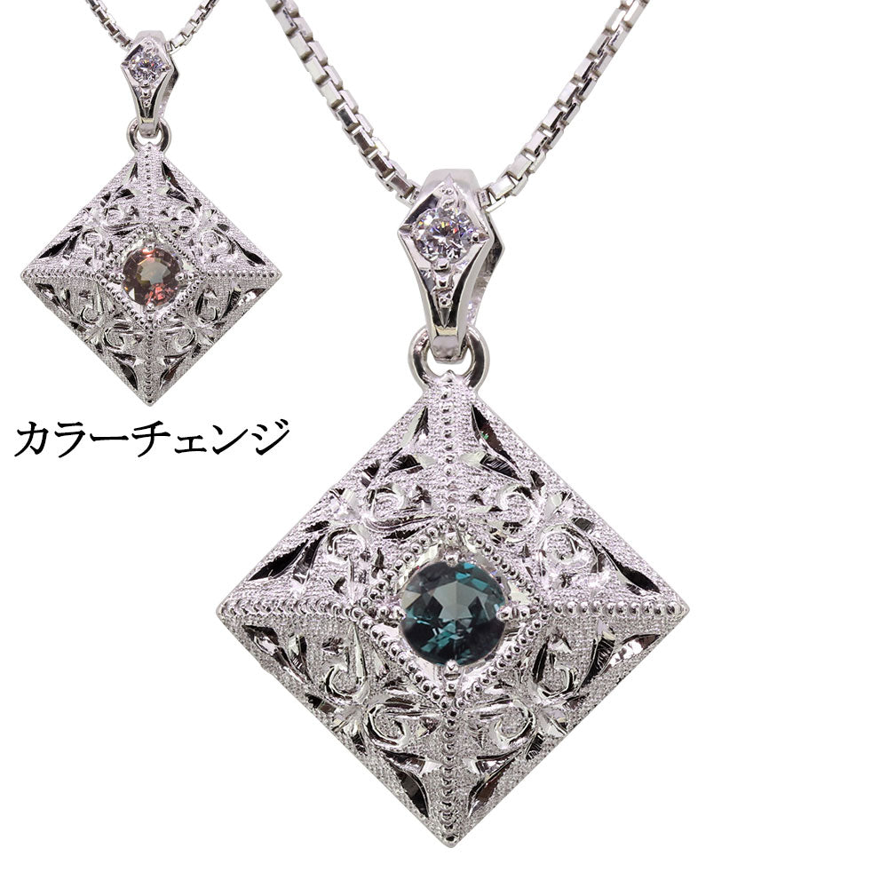 誕生石13石・希少石アレキサンドライトを使用した、レディースネックレス(ペンダント)です。ハワイアンジュエリーとは一味違う洋彫りジュエリー。職人が細部にまでこだわり繊細に仕上げたオリジナルのデザインです。中央で天然石が輝き存在感を放ちます。