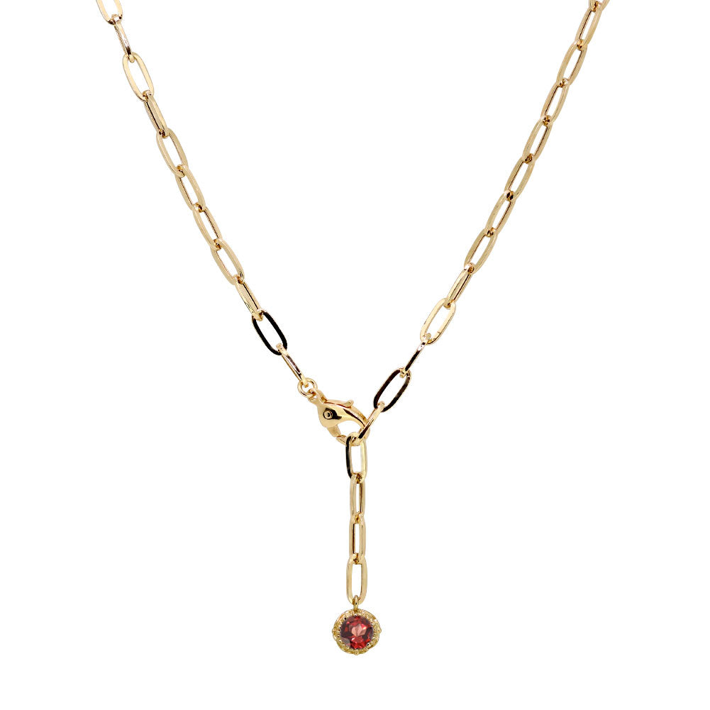 誕生石12石を一粒使用した、18金製ペーパークリップチェーンのY字ロングネックレスです。お好きな位置で留めて長さをアレンジ出来るので、その日のコーデに合わせてお楽しみいただけます。光を受けてキラキラと輝き、Y字シルエットが胸元を美しく飾ります。