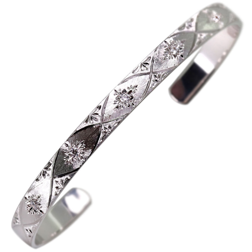 誕生石12石の中から一粒ずつ選べる、格子模様の彫金ペアバングルです。ハワイアンジュエリーとは一味違う彫金ジュエリー。職人が一つ一つ丁寧に仕上げたオリジナルのデザインです。細部にまでこだわった美しい彫り模様に、天然石が煌めく。高級感溢れる輝きで、存在感をプラスしてくれるアイテムです。誕生月や記念月で石を選んでみたり、好きな色、石に込められた意味で選んでみるのも素敵です。