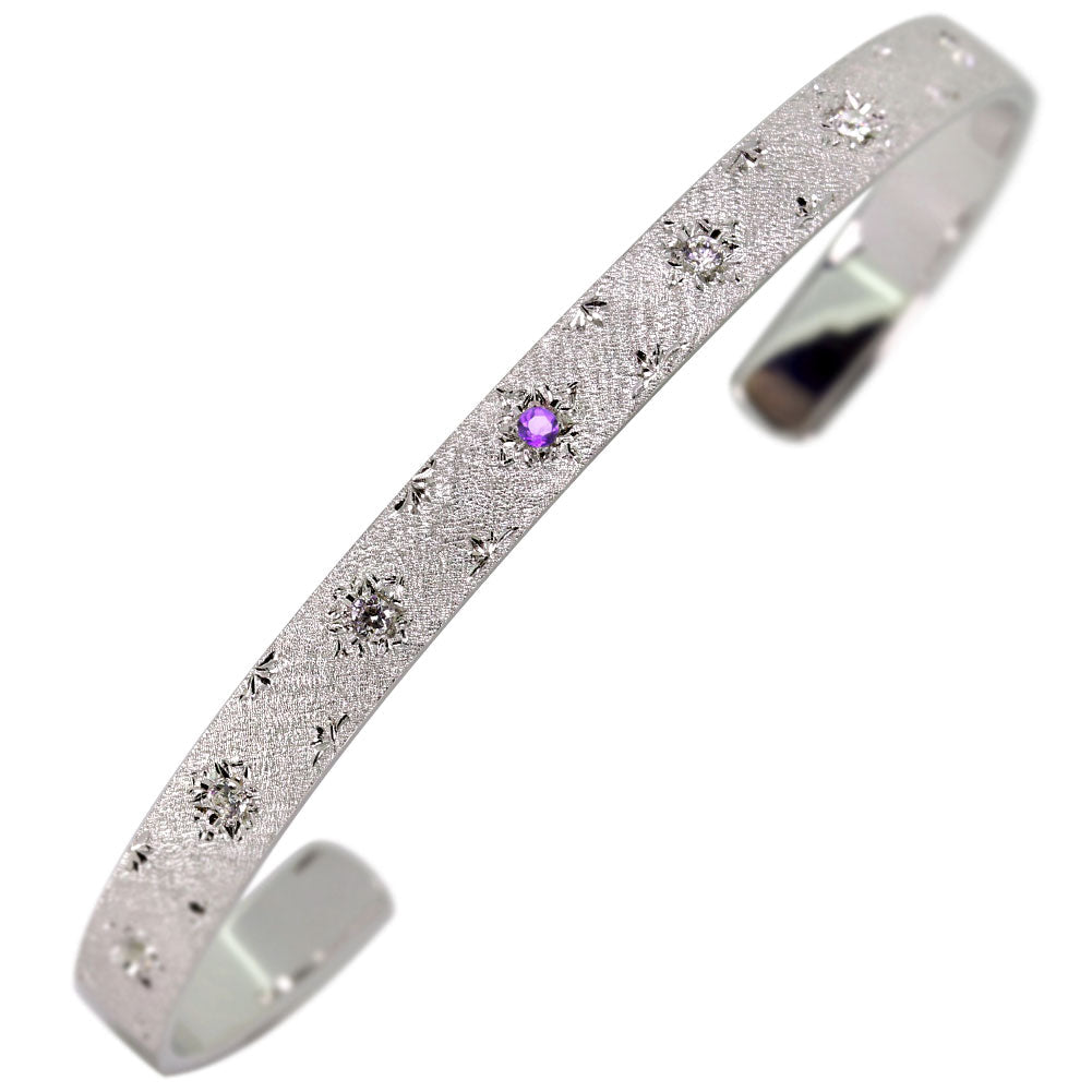 誕生石12石・希少石2石を使用した、レディースバングルです。ハワイアンジュエリーとは一味違う彫金ジュエリー。職人が一つ一つ丁寧に仕上げたオリジナルのデザインです。洗練されたデザインに天然石が煌めく。大人の魅力が際立つバングルに仕上がっています。