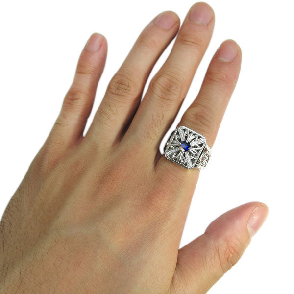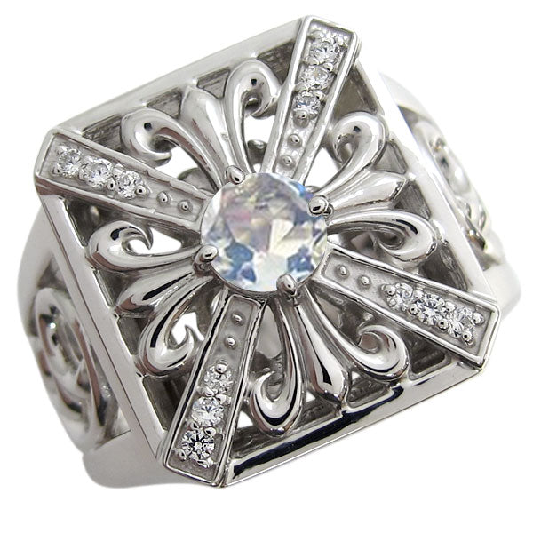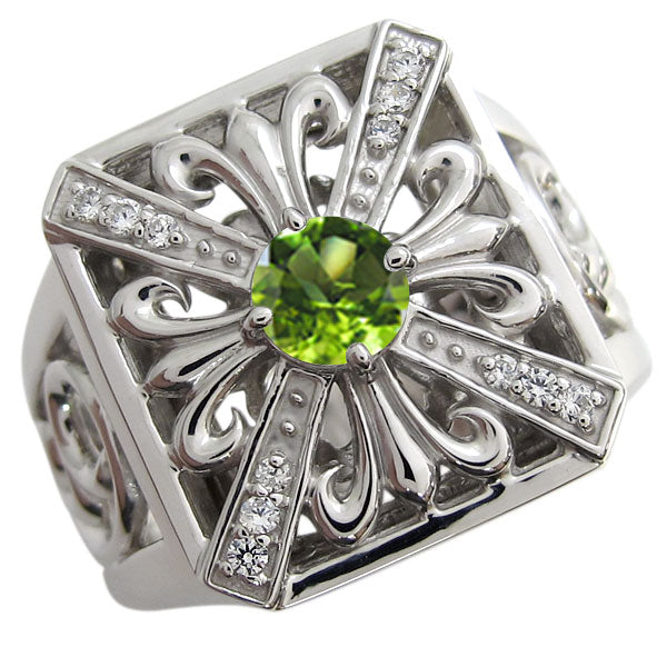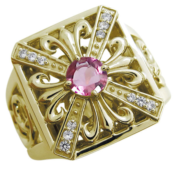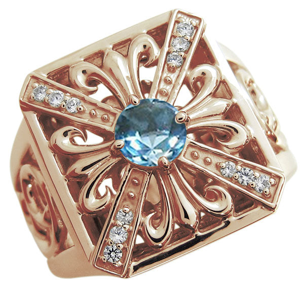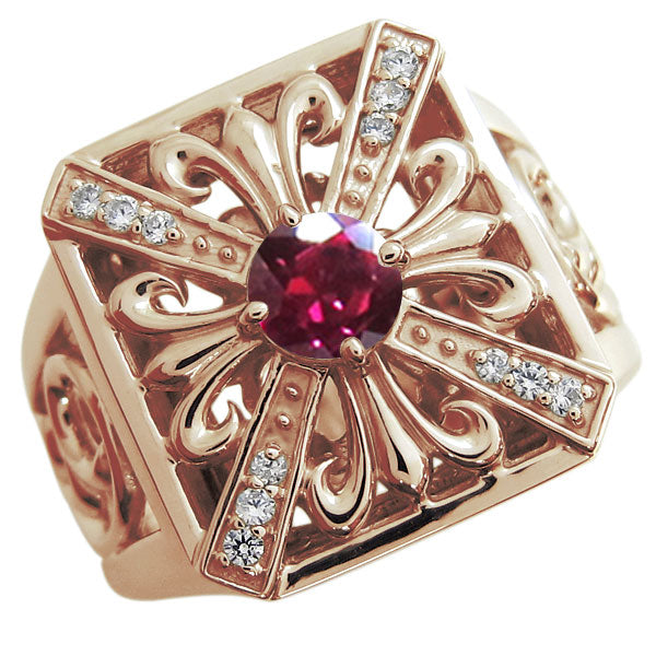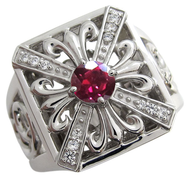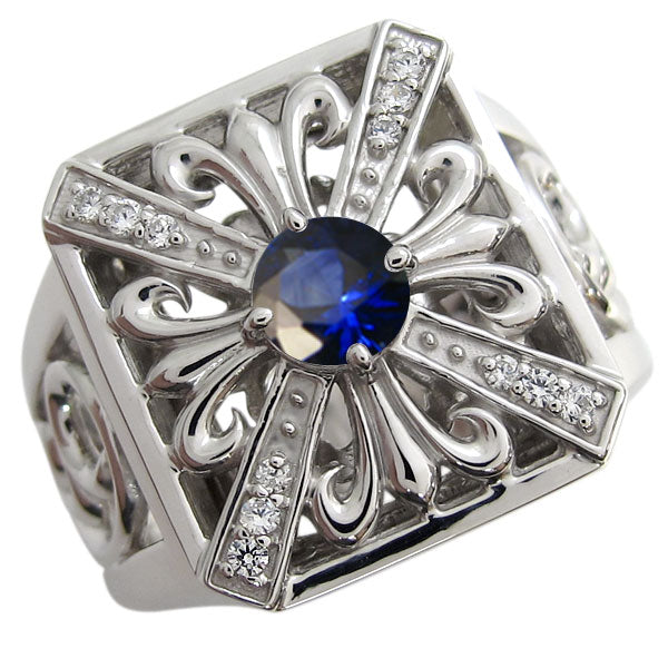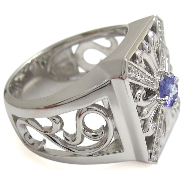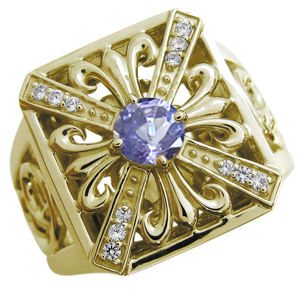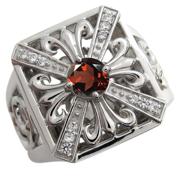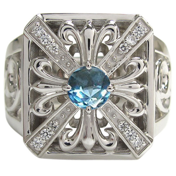 誕生石12石を一粒使用した、クロス&百合の紋章デザインメンズリング(指輪)です。クロスと百合の紋章の組み合わせがクールなメンズリング。サイドの唐草(アラベスク)模様の透かしが、貴方の手元をゴージャスに演出します。